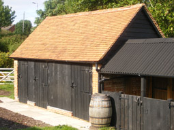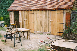 The doorways were kept at their original height and positions. New doors were designed and made based on the assortment of old barn doors. These include a little hayloft door, that replaces one long gone. Only two old-style strap hinges remained on the old barn doors. These have been put back on the new doors, along with new hinges made by a blacksmith to match the existing ones. Wooden oak latches were made to match others found on the farm. The rotten hayloft floor was replaced with strong new wood. All the old clay peg tiles were brushed clean and put back on the roof. The barn is now a safe and useful building, and everyone agrees it is very handsome. |