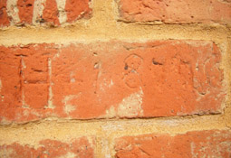 | The old brick barn in the farmyard had suffered over the years. The bottom of the front wall had rotted and the wall had sunk down. The roof had followed and was bowed down at the front. It had also moved sideways over the years. The nails holding the roofing battens had rusted and the battens and clay tiles were starting to slip. The end walls had large cracks in them. The barn was in a dangerous state, but it could be saved. It is a traditional farm building in a vernacular style, so was eligible for some grant aid under the Countryside Stewardship Scheme. It has some old graffiti on the walls, including initials believed to have been carved by local historian E. Kimber, and another older set dated 1877. |