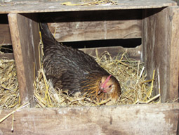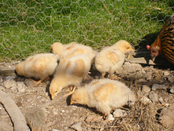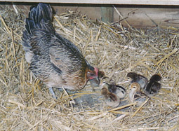 | They are very good at coming home to roost at dusk, although occasionally one will go broody and hide on a secret nest in a barn. Jo usually manages to find them, but twice we have been surprised by the appearance of a hen with a family of chicks. |