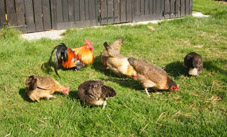 Often the chickens are allowed to free-range around the farmyard, gardens and fields. They also have a secure, fox-proof run and henhouse where they are shut up safely at night. They love to forage for worms and insects, and enjoy eating the grass, too. |